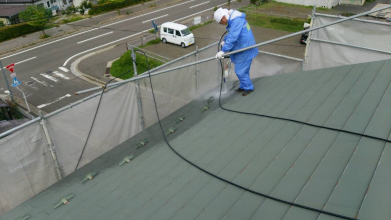 福島市 松川町アパート塗装(塗り替え)リフォーム 2015/06/25 おはようございます。 ペンキン君です。 アパート塗装工事がやっと本格的に動き出しました。 まずは高圧洗浄(水洗い)です。 高圧洗浄をすることにより、汚れ落としはもちろん古くなった塗膜落とし、旧塗膜との食いつきをよくする、雨漏り箇所があるかないかの確認などなど、いろいろな効果があるのです。大事な作業ですね。