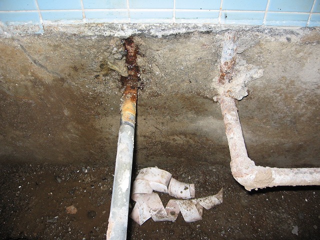 これは風呂場の配管ですが、土間の中の配管が錆びてもろくなっているようです。
